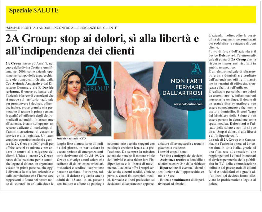 2A Group nasce ad Amalfi, nel cuore della divina Costiera Amalfitana, nel 2009, come azienda operante nel campo delle apparecchiature elettromedicali. Gestita dalla Ceo Stefania Anastasio e dal Direttore Commerciale F. Davide Arianna, il cuore pulsante dell’azienda è la rete di consulenti che si muove sul territorio nazionale per promuovere i devices, offrendo, inoltre, prove gratuite che permettono di testare in prima persona la qualità e l’efficacia degli elettromedicali aziendali. Internamente all’azienda, è stato sviluppato un reparto dedicato al marketing, all’amministrazione, al customer service e alla logistica. Un team completo e professionale che gestisce la 2A Group a 360° gradi per offrire servizi su misura e per andare incontro alle esigenze dei clienti. L’idea di creare 2A Group nasce dalla passione per le tematiche legate al dolore, un argomento vissuto in prima persona, che oggi è diventata la mission aziendale e dalla convinzione che l’home care rappresenti il futuro nel nostro modo di “curarci” in un’Italia dove le lunghe liste d’attesa sono all’ordine del giorno, in particolare in questo periodo di emergenza sanitaria derivante dal Covid-19. 2A Group si rivolge a tutti coloro che soffrono di dolori osteoarticolari, muscolari e tendinei, soprattutto persone anziane. Purtroppo, talvolta, il dolore riguarda anche adulti dai 45 anni in su, persone con fratture o affette da patologie neuromotorie o anche soggetti con patologie croniche legate alla professione. Da sempre la mission aziendale nonchè il motore vitale dell’attività è stata ridare loro l’indipendenza e la libertà di movimento. L’azienda offre i propri servizi anche a centri medici, cliniche private, centri fisioterapici, medici, farmacie e liberi professionisti desiderosi di lavorare con apparecchiature all’avanguardia e tecnologicamente avanzate.